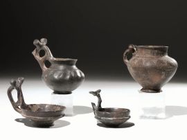 Olla con orlo estroflesso, collo cilindrico a profilo concavo distinto dal corpo ovoide, fondo piatto, ansa a nastro impostata sulla spalla e sul collo decorata alla base del collo con motivo a falsa cordicella da cui pendono una serie di triangoli campiti da linee parallele; attingitoio con orlo estroflesso, collo cilindrico a profilo concavo distinto dal corpo lenticolare, piede troncoconico, ansa a nastro sormontante con ponticello e due apofisi alla sommità decorato a falsa cordicella alla base del collo e baccellature sulla spalla; tazza monoansata con labbro obliquo impostato sulla vasca mediante una carena, vasca baccellata, piede troncoconico, ansa a nastro sormontante con ponticello e due apofisi alla sommità (3)