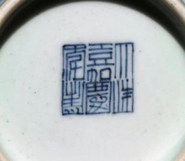 Coppetta Cina sec. XIX in porcellana docai decorta con pipistrelli e ideogrammi, sul fondo marchio Jajing diam cm 15, alt cm. 6,5