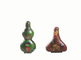 Due snuff bottles, Cina fine dinastia Qing, in smalto cloisonné, una a forma di doppia zucca e con fondo verde, l'altra piriforme e a fondo rosso, alt. cm 8,6; cm 7 (2)