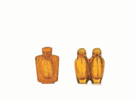 Due snuff bottles, Cina inizi sec. XX, in resina, una di forma squadrata e intagliata con figura di uccello del paradiso, l'altra a doppio vaso, alt. cm 5,4; cm 5,6 (2)