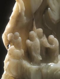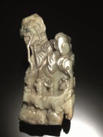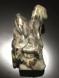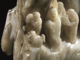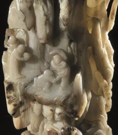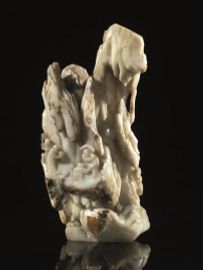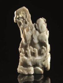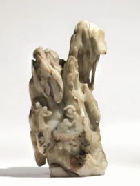 Grande intaglio Cina Dinastia Qing sec. XVIII, in giada  verde pallido, con inclusioni ruggine,  finemente intagliata a tutto tondo, nella forma di un paesaggio  montano con alberi, alt. cm 27