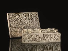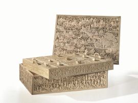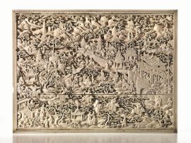 Grande scatola porta lavoro, Cina prima metà sec. XIX, in avorio, finemente e riccamente intagliata in alto rilievo con scene a paesaggio di giardini con pagode e moltitudine di persone tra le quali dignitari, cacciatori a cavallo e pescatori. L’interno celante un vassoio estraibile con marchi a finto bamboo e tredici scomparti con coperchi intagliati e con pomolo a guisa di frutto, il tutto celante tre ulteriori scomparti, cm 12x37x27.5, un pomello mancante all’interno
