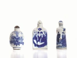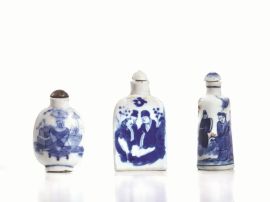 Tre snuff bottles, Cina sec. XX, in porcellana bianca e blu, con decori e forme diverse, alt. cm 8,2; cm 7,9; cm 6.6 (3)