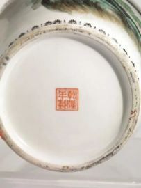 Vaso, Cina Periodo Repubblicano, in porcellana, decorato a paesaggio con pagoda e montagne, reca marchio Qianlong, alt. cm 36,5