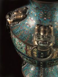 Vaso Cina sec. XIX, in metallo cloisonné, decorato con motivi geometrici e floreali, le spallette decotate con appliques a forma di testadi belva, alt. cm 29