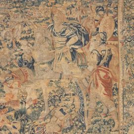 Arazzo, Manifattura di Anversa, fine sec. XVI, raffigurante il trionfo di un condottiero nell'antica Roma. In basso a destra lungo il bordo azzurro è riconoscibile il marchio tipico della produzione di Anversa della fine del XVI secolo, una mano aperta tra le lettere I e D, cm 308x393