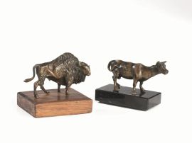 Piccola scultura, Arte fiamminga, sec. XIX, in bronzo raffigurante una mucca, alt cm 5,5, lungh. cm 12, su base in marmo, e piccola scultura, Scuola Nord-Europa, fine sec. XIX, in bronzo modellata come un bisonte, alt. cm 7, lungh. cm 11, su base in legno (2)