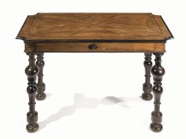 Tavolo da centro, ultimo quarto sec. XVII, in radica di olivo e legno ebanizzato, piano rettangolare con angoli sagomati centrato da grande croce dei Cavalieri di Santo Stefano, un cassetto nella fascia, gambe a balaustro tornite ed ebanizzate su piedi a cipolla schiacciata, cm 112x63x79