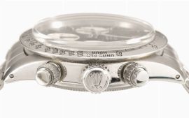Cassa in due corpi con fondello a vite, pulsanti cronografici tondi, vetro plastica. Quadrante argentè con indici e numeri arabi applicati, con scale telemetriche e tachimetriche periferiche, tre quadranti ausiliari ad ore 3,6 e 9 rispettivamente con registro dei 30 minuti, delle 12 ore e secondi continui, secondi cronografici al centro. Movimento a carica manuale. Bracciale a maglie Oyster rivettate con chiusura deployante. Corredato di bracciale originale a maglie Oyster rivettate. Diam. mm 36,5