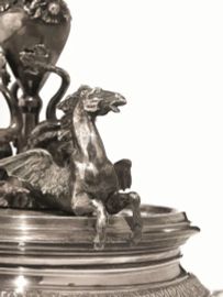 Alzata, Stato Pontificio, 1840 circa, in argento, base circolare decorata da foglie d’acanto su cui poggiano tre cavalli marini, fusto con nodo piriforme decorato da conchiglie in rilievo, coppa sbalzata a baccellature, alt. cm 34,5, diam. cm 29, g 1510, mancante dell’interno in cristallo