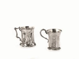 Boccale, Londra, 1852, in argento, corpo decorato da tralci di fiori, presa a voluta, alt. cm 9,5, g 180 ed altro boccale, Londra 1846, in argento, decorato a volute, presa a voluta, alt. cm 10,5, g 155 (2)