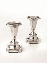 Calice, Toscana, sec. XVIII, in argento, piede circolare, fusto con nodo sferico, coppa con interno vermeil, alt. cm 21, g 400 ed una coppia di candelieri, Porto, fine sec. XVIII, in argento, ciascuno poggiante su base quadrata, fusto modellato come un calice, alt. cm 11, g 515 (3)