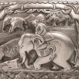 Servito da tè, India, sec. XX, in argento riccamente sbalzato e cesellato con scene di genere con figure ed animali tra volute, composto di vassoio, teiera, lattiera e zuccheriera. Il vassoio è di forma ovale ed è decorato sul piano da scena di figure indiane danzanti, la teiera ha una presa realizzata come una figura in abiti indiani ed il beccuccio modellato ad animale fantastico, la zuccheriera e la lattiera hanno prese raffiguranti draghi; i finali dei coperchi sono modellati ad animali fantastici, g 4330 (4)