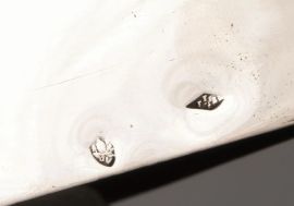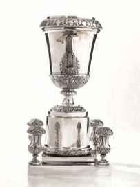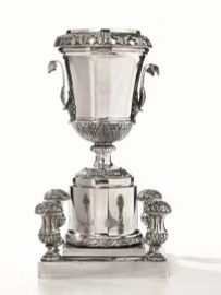 Sourtout de table, Forlì, 1810 circa, facitore Francesco Balzani, in argento, base quadrata decorata ai quattro angoli da vasetti con fiori cesellati, al centro un sostegno cilindrico su cui poggia una coppa cesellata a foglie d’acanto, due anse desinenti a volute unite al corpo da infiorescenze, alt. cm 41