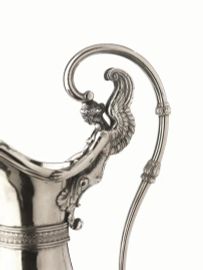 Versatolo, Austria Ungheria, prima metà sec. XIX, in argento, corpo piriforme decorato da fascie di foglie e perlinature, piede circolare, ansa a voluta unita al corpo nella parte inferioreda testa di caprone in rilievo e nella parte superioreda figura femminile alata , alt. cm 39, g 1440