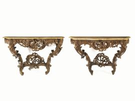 Coppia di consoles, Venezia, ultimo quarto sec. XVIII, in legno dolce riccamente intagliato, piano sagomato in marmo giallo di Siena, pendaglina traforata e intagliata a volute e motivi floreali, gambe mosse con decorazione scolpita e traforata a foglie di acanto e piccoli fiori, piedi a ricciolo riuniti da traversa centrata da conchiglia rocaille, cm 128x61x79, danni, mancanze e restauri (2)