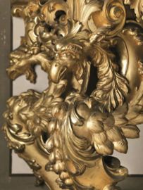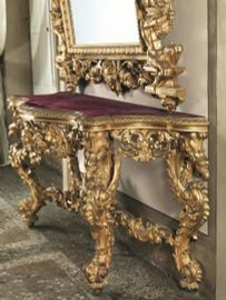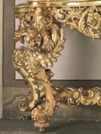 Grande console, Firenze, 1860 circa, attribuita a Francesco Morini, in legno intagliato e dorato con alternanza di oro lucido e satinato, piano sagomato in velluto di seta cremisi, bordo intagliato a palmette, ampia fascia intagliata e traforata a girali e motivi floreali, centrata da protome femminile, gambe modellate a grifoni alati stanti, piedi a ricciolo, crociera sormontata da canestro con fiori, cm 207x74x105, lievi danni