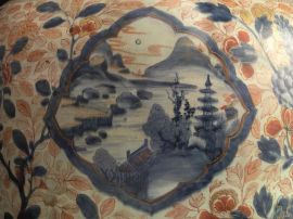 Grande potiche con coperchio, Cina, sec. XVIII, in porcellana Imari, finemente dipinta a ramage fioriti e con otto riserve romboidali decorate a paesaggi, il collo con decoro ruyi, il coperchio con quattro ulteriori riserve, alt. cm 82, un restauro al collo