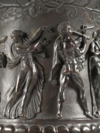 Grande vaso, Scuola Romana, fine sec. XVIII, in bronzoì, copia neoclassica del Vaso Borghese. Corpo decorato a baccellature intervallate da due coppie di teste virili, fascia centrale scolpita ad altorilievo con scene dionisiache, bordo superiore percorso da tralcio di vite, alt. cm 52,5, diam. cm 37, difetti