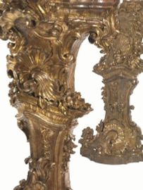 Importante coppia di gueridons, Palermo, seconda metà sec. XVIII, in legno intagliato e dorato a mecca, piani sagomati con becco di civetta in lumachella, fascia modanata sotto al piano, sostegno svasato di ispirazione architettonica inciso sul fondo a treillage e riccamente decorato a motivi rocaille che si sviluppano in conchiglie, cornici asimmetriche, volute di foglie di acanto e fiori fino a ricoprire quasi comoletamente la struttura, base sagomata, cm 60x33x88