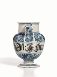 Orciolo, Bassano, manifattura Manardi, sec. XVIII, in maiolica, decoro in monocromia blu, a tralci fogliati con fiori polipetali; al centro nella fascia scritta apotecaria in caratteri gotici in bruno manganese, alt. cm 18,5, restauri e sbocconcellature al piede