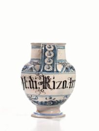 Orciolo, Bassano, sec. XVIII, in maiolica con decoro “a ghirlande” e al centro nella fascia scritta apotecaria in caratteri gotici in bruno manganese, alt. cm 20,5, restauri al collo, al pippio e al piede