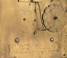 Orologio a mensola, metà sec. XVIII, epoca Luigi XIV, cassa intarsiata in tartaruga e ottone dorato e decorata in bronzo dorato da figura di Nettuno in basso rilievo, profili e piedi anch'essi in bronzo dorato forgiato a motivi rocaille, quadrante in bronzo e smalti sormontato dall'allegoria del tempo. Mensola analogamente eseguita, alt. cm 136. Quadrante e meccanismo firmati Noel Baltazar à Paris
