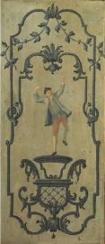 Porta a due ante, Veneto, sec. XVIII, in legno dipinto nei toni del bianco e dell'azzurro, ed in parte argentato, ciascuna anta decorata su entrambi i lati da tre formelle sagomate di cui quelle superiori e inferiori inquadrano cesti di fiori entro riserve mistilinee, mentre quelle centrali inquadrano figure di gentiluomo e gentildonna da un lato e popolani che danzano dall'altro, cm 233x60, piccoli danni e cadute di colore (2)