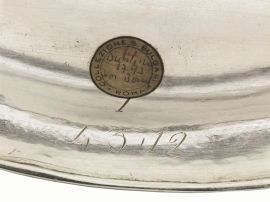 in argento di forma ovale, coprchio con stemma nobiliare inciso e iscrizione IN MEDIO TUTISSIMUS IBIS, cm 41x22,5, g 2570. Recano il cartellino della Collezione S. Bulgari-Roma (2)
