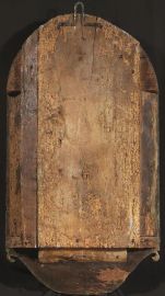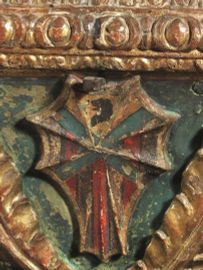 altorilievo in terracotta policroma entro tabernacolo ligneo coevo e centinato con intagli nella cornice a ovuli e palmette, dorato e dipinto con motivo di candelabre nella parte interna dell’arcata; parti di antica decorazione pittorica nella tavola di appoggio. Mensola scolpita a foglie d’acanto, dorata e dipinta, centrata da uno stemma nobiliare, cm 130x70x25