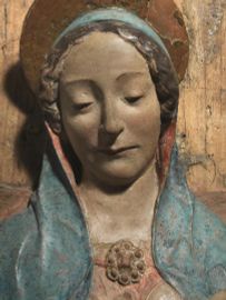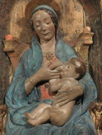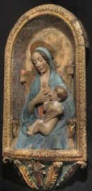 L’importante opera presentata in questa sede, raffigurante la Madonna che allatta il Bambino, denominata tradizionalmente Madonna del latte, restituisce un effetto di grande evidenza e profondità tale da conferire ad un altorilievo in terracotta l’effetto di un compiuto tuttotondo. Questo risultato, reso ancor più evidente da un punto di vista ribassato per il quale la scultura era stata ideata, è frutto di un procedimento di forte scorcio, ottenuto mediante la collocazione delle due figure all’interno di una sorta di nicchia decorata a motivo di candelabre e dall’utilizzo di uno scranno fortemente prospettico che emerge dal fondo. Contribuiscono inoltre a conferire all’altorilievo una forte profondità il particolare taglio della figura della Vergine al di sotto delle ginocchia e l’utilizzo di un nimbo aggettante.