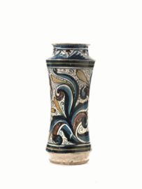 Earthenware, painted in cobalt blue, antimony yellow, brownish and blackish manganese, and manganese purple