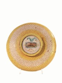 Earthenware, painted in orange, antimony yellow, green, blue, blackish and brownish manganese, and tin white