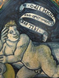 On the body, in a cartouche, Latin proverb ‘.OdIE.MICHI.. / HOC..OPUS.. HORATII / CRAS. TIBI..’; down below, the name of the preparation in Gothic script ‘Aqua.de.planta’