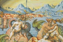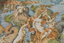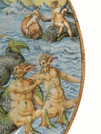On the back, beneath the base, inscription in cobalt blue ‘Venere sene va aspasso p(er) il mare con/le Nereide apuleio nel primo dela/faula di psiche’; label, typewritten with ‘C. 13747’.
