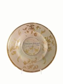 Earthenware, painted in orange, yellow, green, blue, blackish and brownish manganese, and tin white; highlights of golden lustre on the front and back.