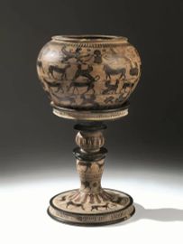 Il dinos è completo di un sostegno tornito a balaustro di alt. cm 33 eseguito in epoca posteriore e decorato in maniera analoga alla superficie del vaso. Il sostegno è ricomposto