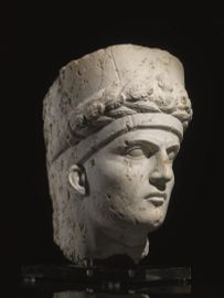 La scultura, di dimensioni superiori al vero, rappresenta il defunto probabilmente effigiato come banchettante sulla kline la testa infatti è ruotata sul collo a sinistra e inclinata; indossa il modius, tradizionale copricapo dei sacerdoti di Palmira, alto e spartito in tre settori da linee verticali; sulla fronte si intravede la fodera interna; una ricca ghirlanda di foglie di alloro e quercia sostiene al centro un clipeo con un busto maschile paludato. Il volto è fortemente caratterizzato con tre profonde increspature sulla fronte, sopracciglia accuratamente delineate, arcate orbitali nettamente chiaroscurate con palpebre in rilievo ed indicazione del dotto lacrimale; il naso largo e virile è solcato alla base da due rughe, la bocca presenta labbra carnose e socchiuse, il mento è lievemente pronunciato in avanti e gli zigomi ben rilevati, il collo è scolpito con indicazione della muscolatura, mentre le orecchie sono rese in maniera piuttosto sommaria; nella parte posteriore la testa non è lavorata