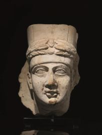 Testa di sacerdote di Bel in posizione frontale, indossa il modius, tradizionale copricapo dei sacerdoti di Palmira, alto e spartito in tre settori da linee verticali; sulla fronte si intravede la fodera interna; una ricca ghirlanda di foglie di quercia sostiene al centro un busto maschile paludato con sulla testa un modio analogo. Il volto è caratterizzato da una fronte bassa, sopracciglia ad incisione, occhi con indicazione della palpebra, della pupilla e dell’iride tramite incisioni, naso rettilineo con profonde solcature alla base, bocca semichiusa con labbra sporgenti, mento arrotondato, due profonde solcature semicircolari sul collo ne indicano l’etàmatura, le orecchie sono molto stilizzate; nella parte posteriore si conserva la lastra da cui sporgeva in altorilievo