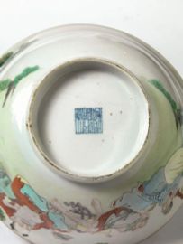 Ciotola Cina dinastia Qing, sec. XVIII , in porcellana finemente decorata con figure di saggi, reca marchio Qianlong (1736-1795), diam. cm 19,2 , restauri