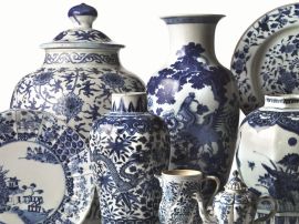 Coppia di potiches, Cina dinastia Ming, (1368-1644), in porcellana bianca e blu, decorate a ramages floreali, un coperchio forse non pertinente, alt. cm 50 (2)