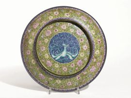 , in smalto di Canton, finemente decorato con figure, fiori e farfalle, diam. cm 26,5