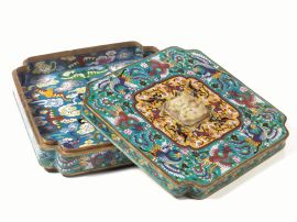 Scatola Cina fine dinastia Qing (1644- 1911), in smalto cloisonnè, di forma squadrata e con angoli concavi, riccamente decorata a motivi floreali e di fenici esternamente, e con pipistrelli e nuvole internamente, il coperchio centrato da una placca in giada, cm 32x8x32  A late Qing cloisonnè enamel box with cover