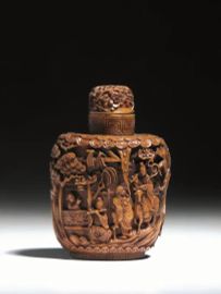 Snuff bottle, Cina sec. XVIII-XIX , in osso inciso raffigurante i sette saggi della tradizione taoista, alt. cm 9,5