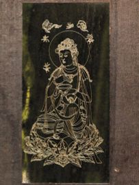 Sutra sul cuore Cina sec. XX , composto da otto placche in giada Kotan finemente inscrtte e con figure, montate a libro con copertine in legno, cm 23x14,2; placche cm16x18