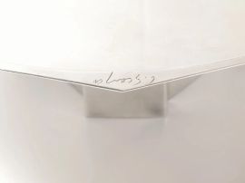 Alzata , in argento, di forma circolare con bordo sfaccettato, reca la firma C. Scarpa e la dedica Scarpa per Cleto Munari, diam. cm 30, alt. cm 8, g 1048