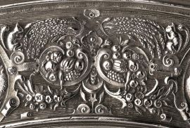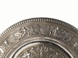 in argento riccamente sbalzato a grottesche e figure allegoriche, diam. cm 47, g 2020