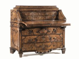Cassettone scrivania, Lombardia, metà sec. XVIII, in noce e radica di olivo, coronato da piccola alzata, modanata con due pianetti reggicandele, sportello a ribalta, decorato con riserve mistilinee, in rilievo che si ripetono sul fronte e sui fianchi, scarabattolo con sei cassetti, un sottile cassetto nella fascia e tre sottostanti, fronte e fianchi mossi, pendaglina frontale, piedi a plinto, cm 139x54x130, piccoli danni