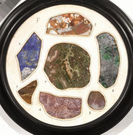 E) 1. diaspro giallo (Russia, Urali), 2. agata fasciata (India Gujarat), 3. diaspro giallo e rosso (Russia, Urali), 4. agata zaffirina del Brasile, 5. turchese tibetano, 6. diaspro bruno, 7. diaspro brecciato F) 1. diaspro brecciato (India Gujarat), 2. verde di Corsica, 3. agata erborizzata (India, Uttarpradesh), 4. diaspro rosso (Egitto, di scavo), 5. diaspro giallo, 6. lapislazzuli di Badakshan, 7. diaspro fossilifero, diam. cm 47 (2)