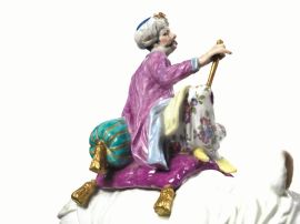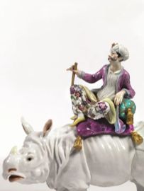 Statuina, Meissen, sec. XX, in porcellana bianca modellata come un rinoceronte cavalcato da una figura di turco in policromia, alt. cm 22,5
